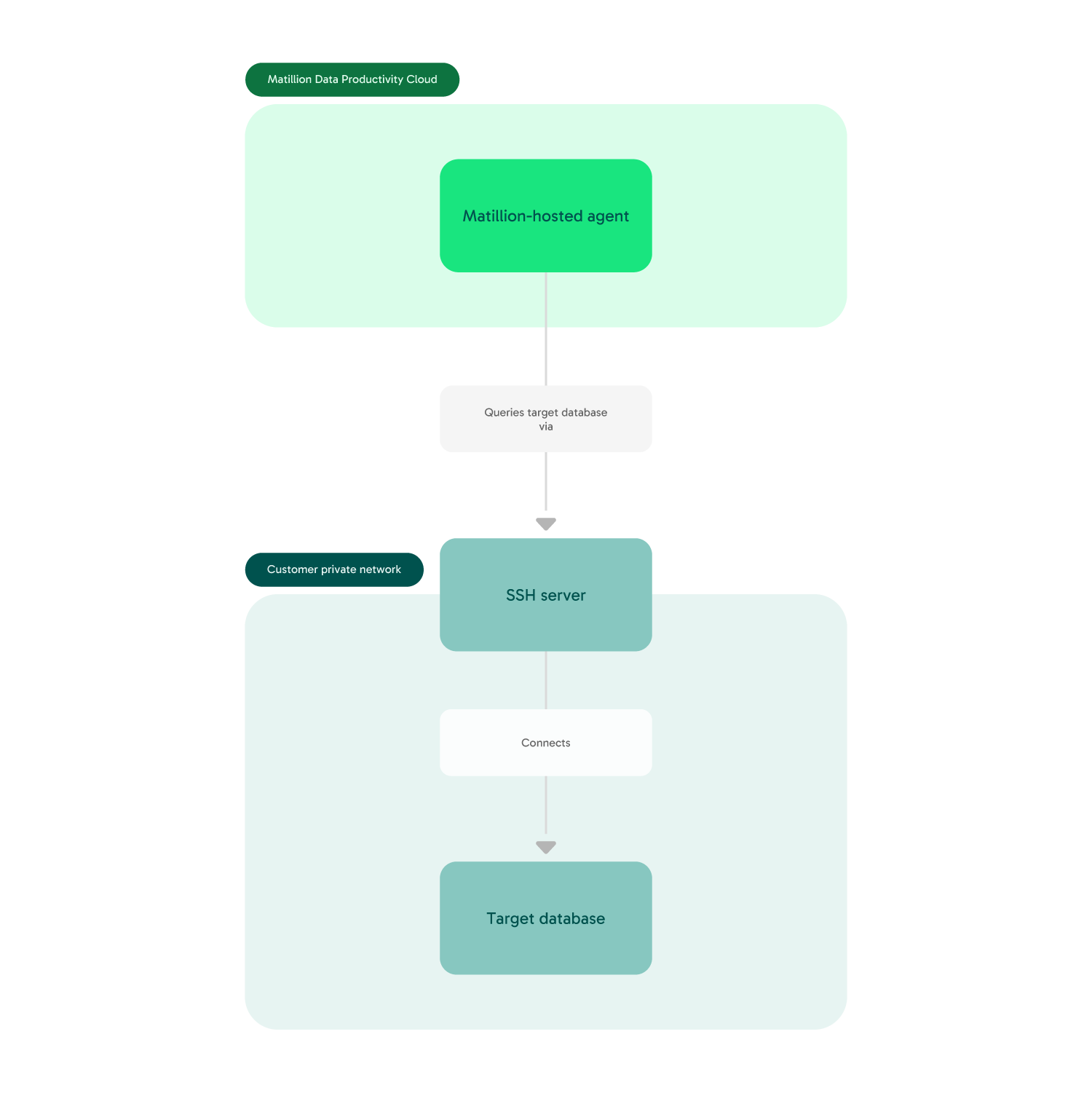 Matillion-hosted agents in the Data Productivity Cloud can connect to network-secured databases using an intermediate SSH server that is part of the same network as the target database.
